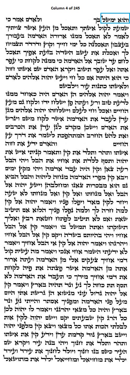 Column 4 of the Torah Scroll begins with the following distinct Line 1 Keywords; this is the only column in the entire Scroll that begins with these keywords: