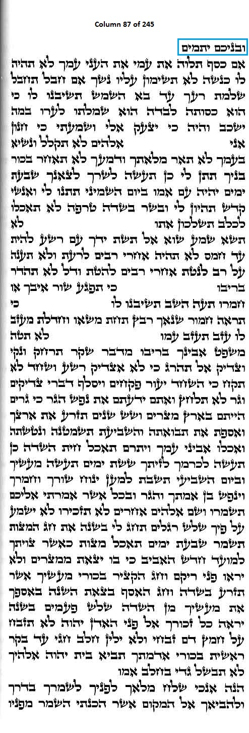 Column 87 of the Torah Scroll begins with the following distinct Line 1 Keywords; this is the only column in the entire Scroll that begins with these keywords: