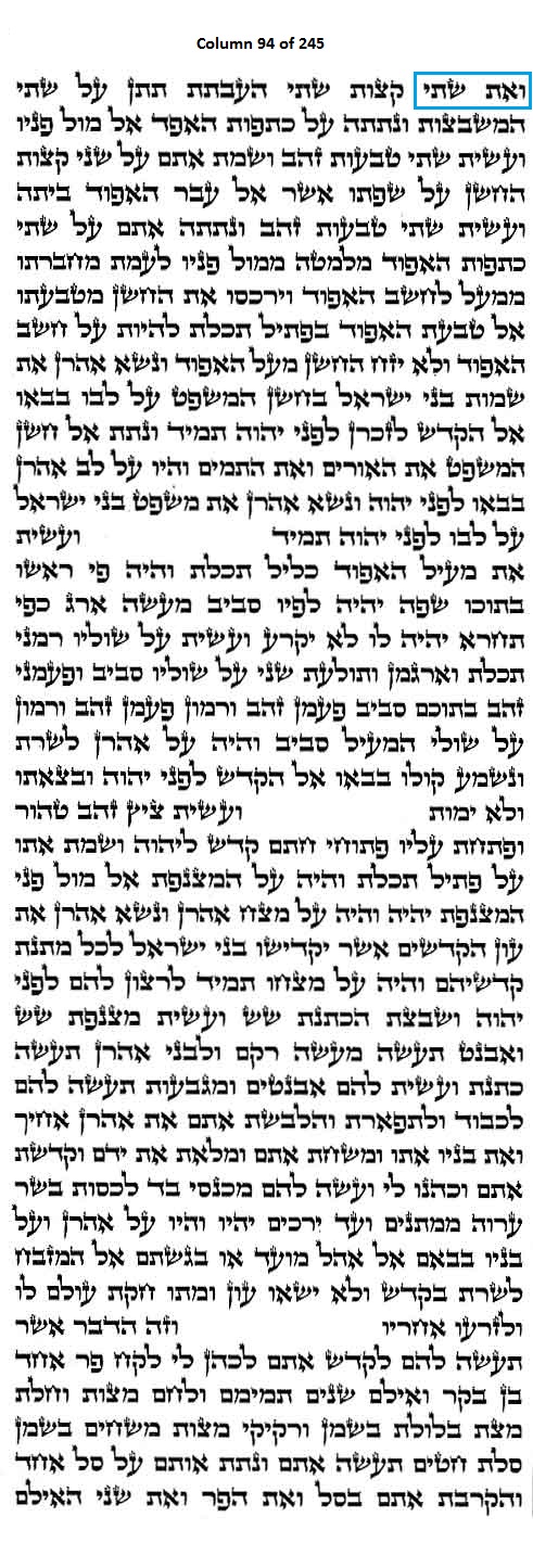 Column Contents include readings from Exodus for Parsha Tetzaveh: