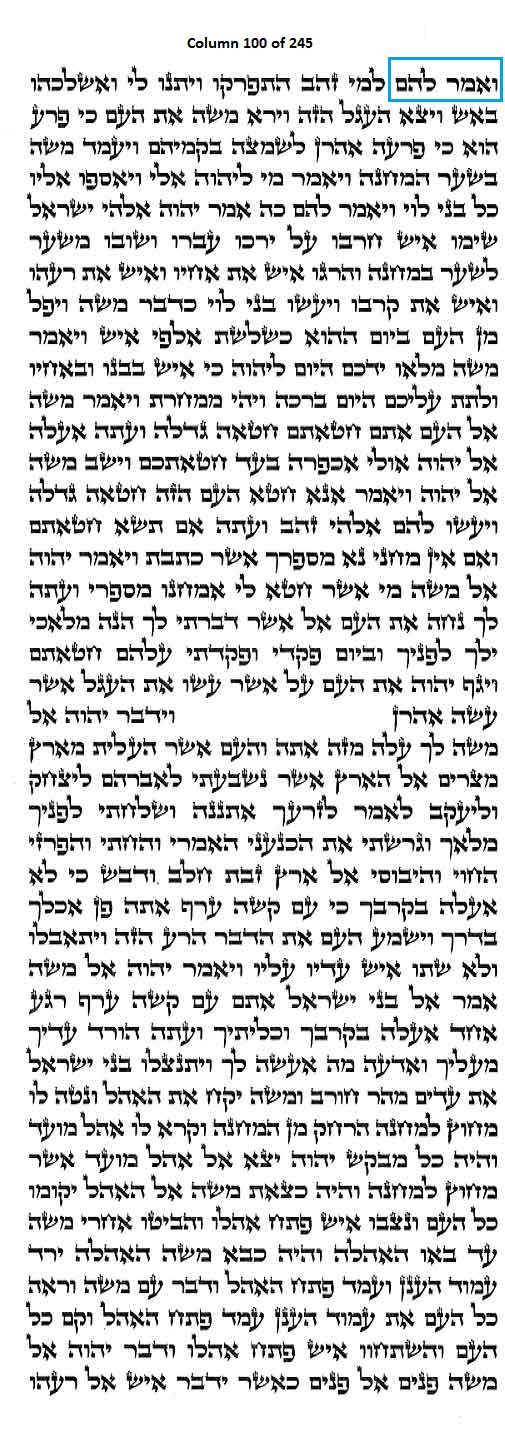 Column 100 of the Torah Scroll begins with the following distinct Line 1 Keywords; this is the only column in the entire Scroll that begins with these keywords: