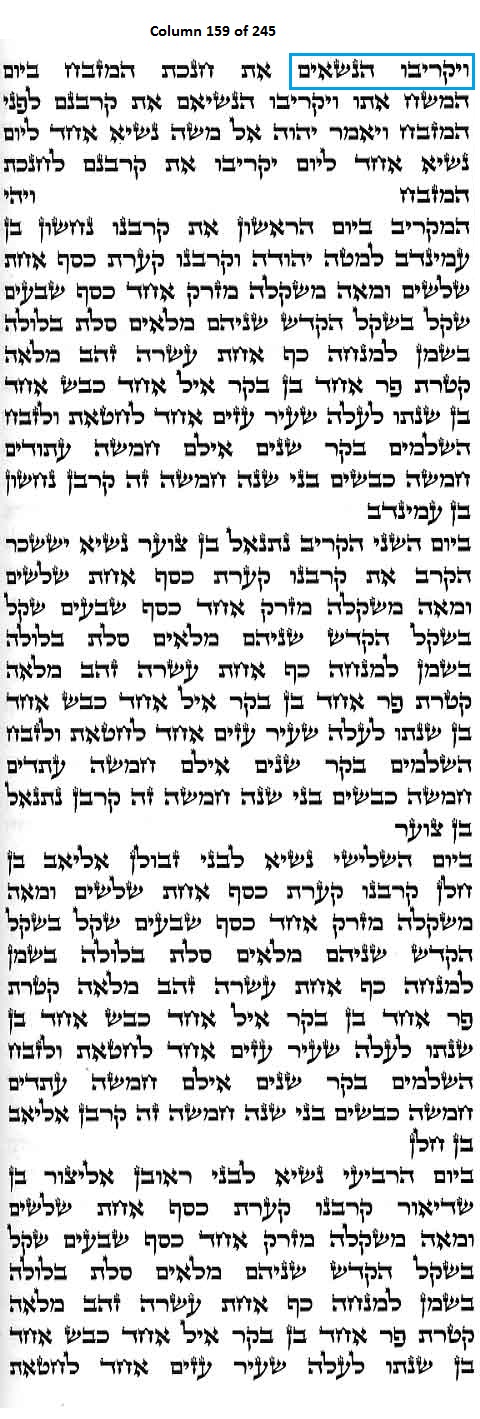 Column 159 of the Torah Scroll begins with the following distinct Line 1 Keywords; this is the only column in the entire Scroll that begins with these keywords: