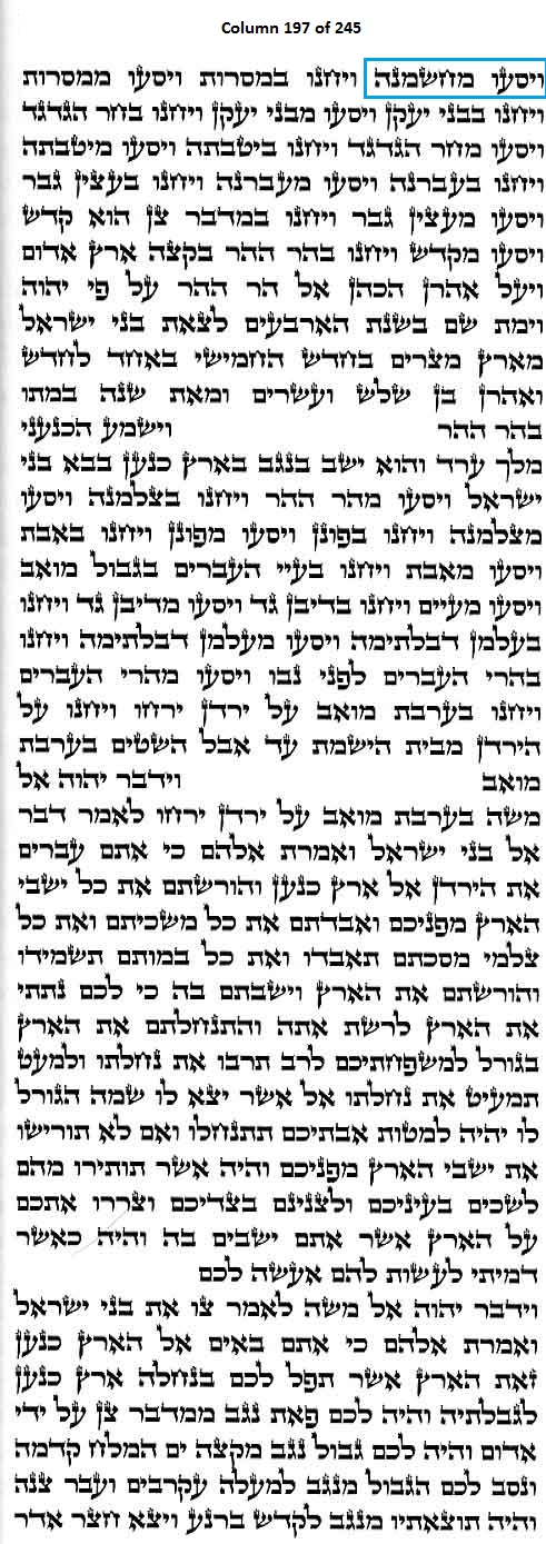 Column 197 of the Torah Scroll begins with the following distinct Line 1 Keywords; this is the only column in the entire Scroll that begins with these keywords: