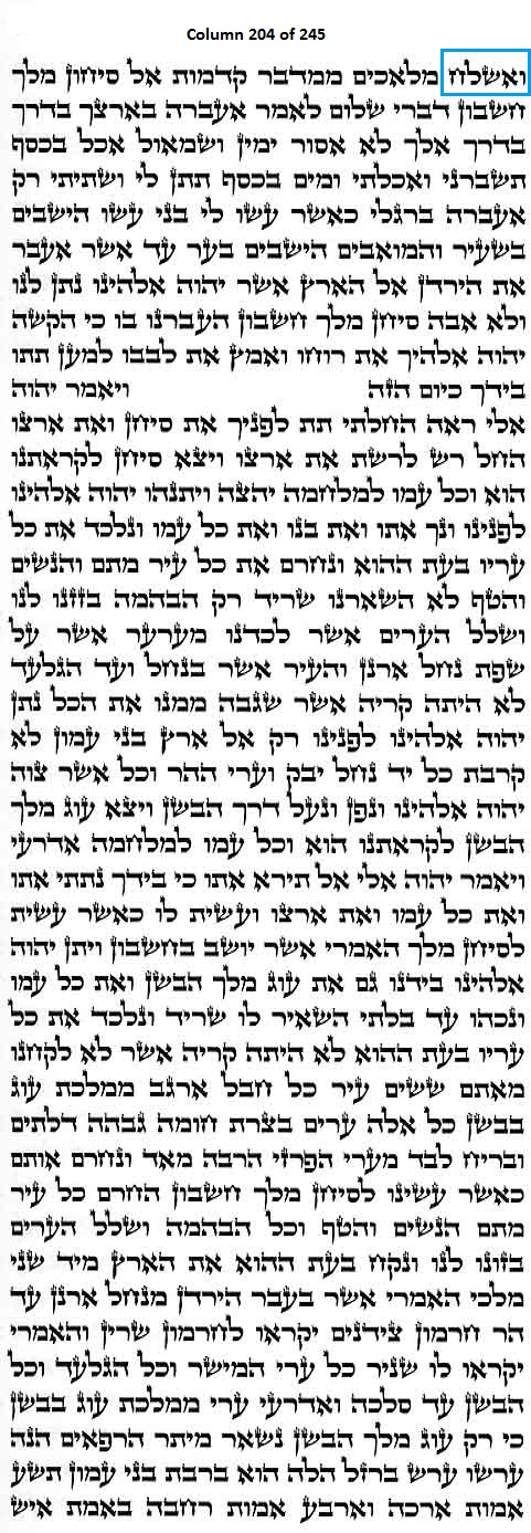 Column 204 of the Torah Scroll begins with the following distinct Line 1 Keyword; this is the only column in the entire Scroll that begins with this keyword: