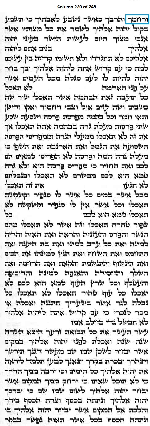 Column 220 of the Torah Scroll begins with the following distinct Line 1 Keyword; this is the only column in the entire Scroll that begins with this keyword: