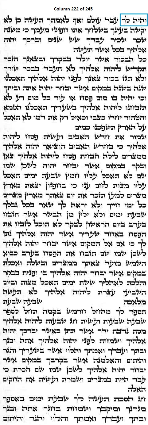 Column 222 of the Torah Scroll begins with the following distinct Line 1 Keywords; this is the only column in the entire Scroll that begins with these keywords: