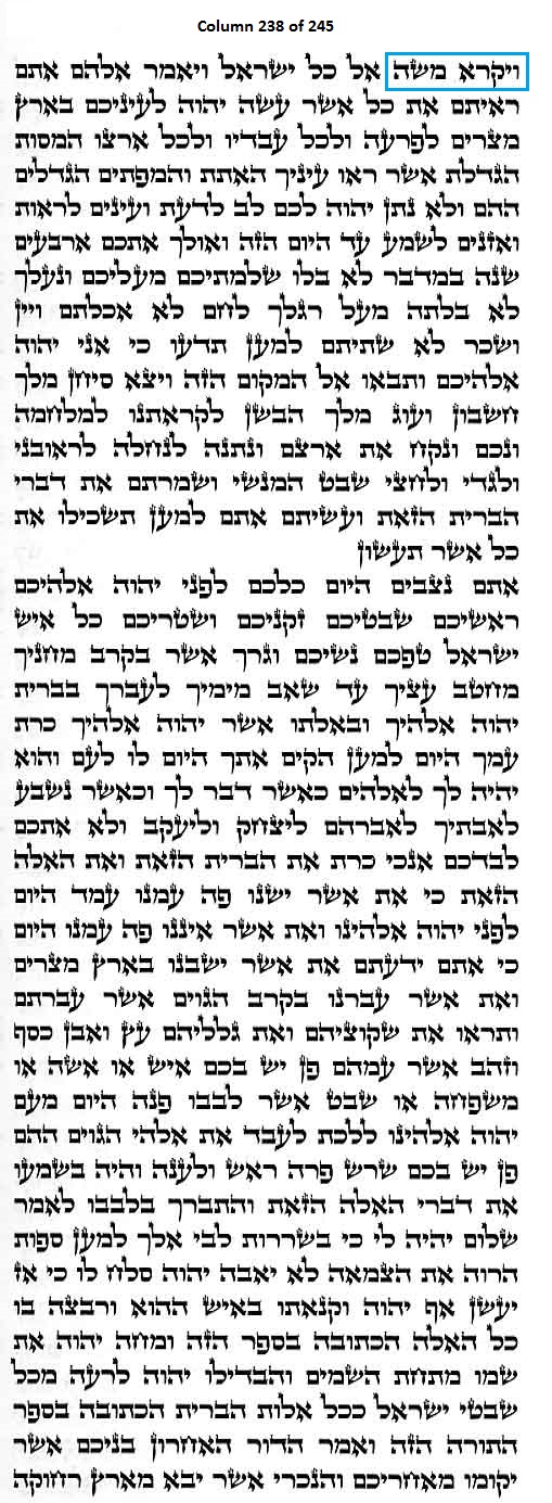 Column 238 of the Torah Scroll begins with the following distinct Line 1 Keywords; this is the only column in the entire Scroll that begins with these keywords: