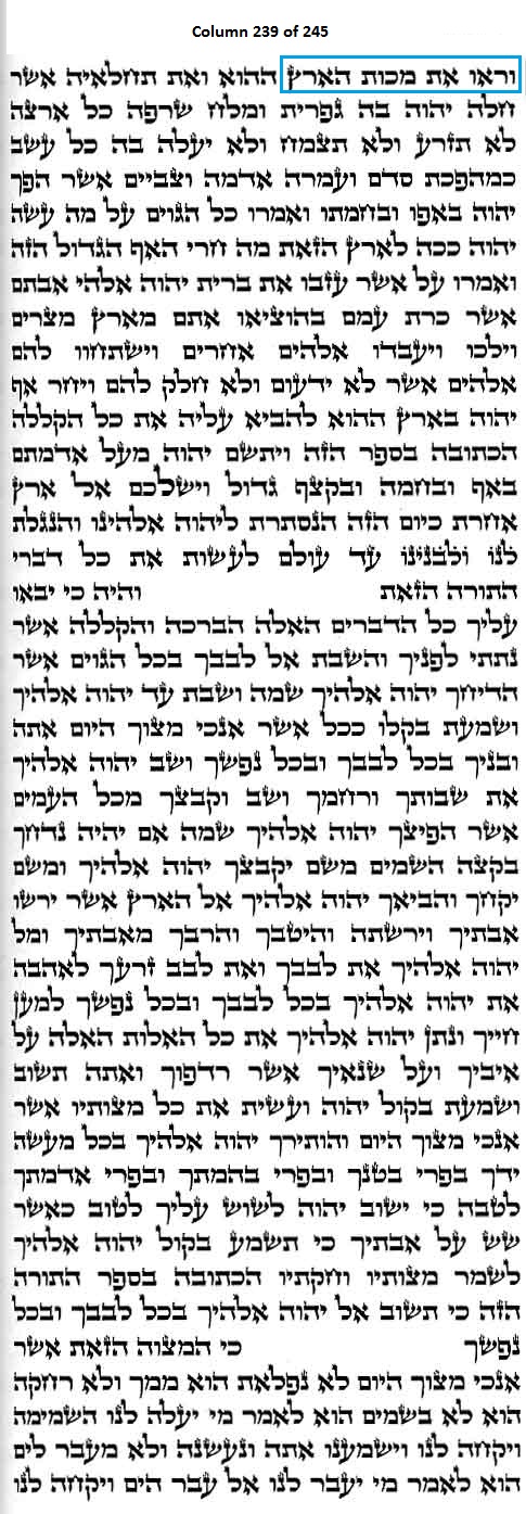 Column 239 of the Torah Scroll begins with the following distinct Line 1 Keywords; this is the only column in the entire Scroll that begins with these keywords: